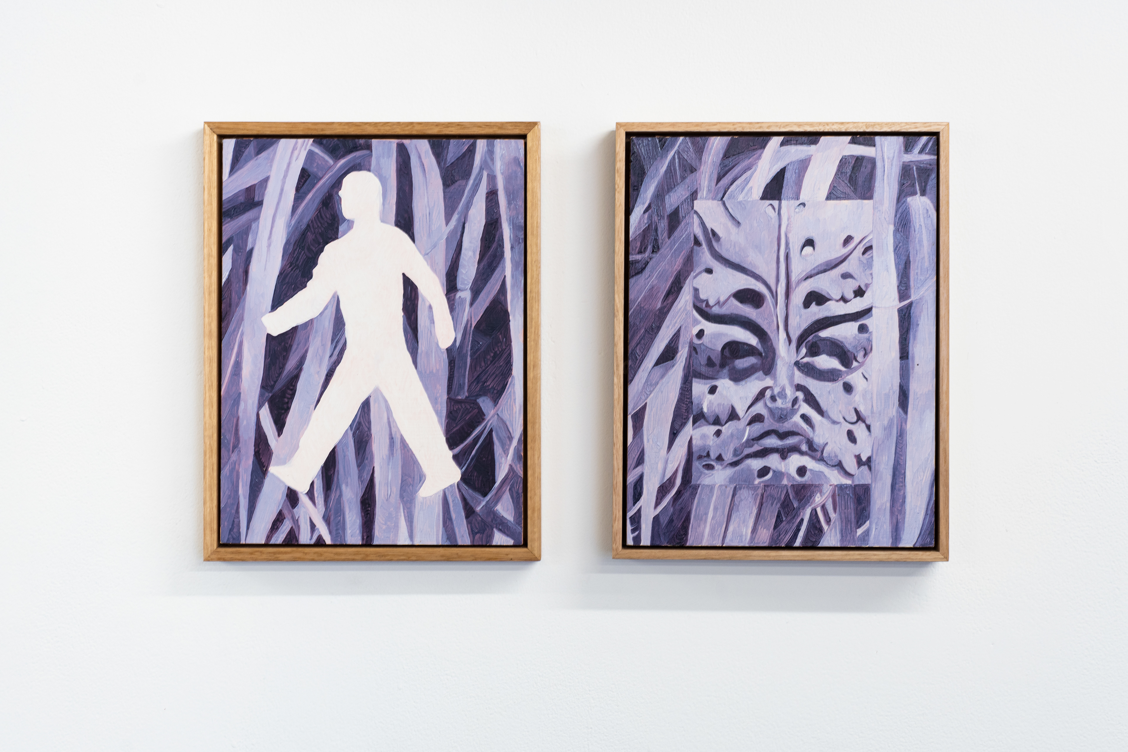The series of paintings, stopping place, presents monochromatic images overlaid upon backgrounds of